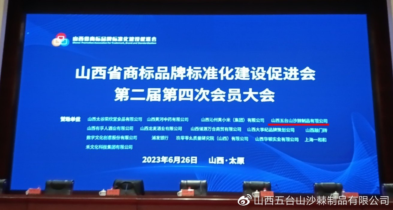 2023年6月26日上午,山西省商标品牌标准化建设促进会(以下简称省品促会)第二届第四次会员大会在省城太原隆重召开。作为省品促会的理事单位及本次大会特邀的14家赞助单位之一,山西五台山沙棘制品有限公司派代表参加了此次盛会。