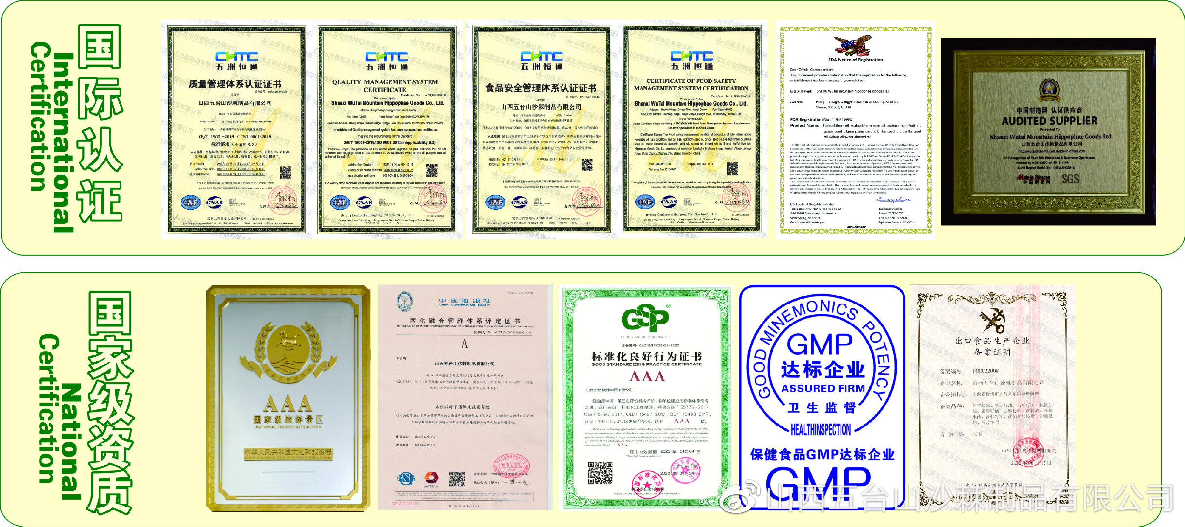 目前,公司通过了ISO9001和ISO22000认证,拥有GMP保健食品洁净车间及出口备案证书等,取得了FDA、清真Halal、企业标准化良好行为AAA级等标准认证。入围了第二届忻州市市长质量奖提名奖;董事长赵志侃被评为质量管理工作先进个人。
